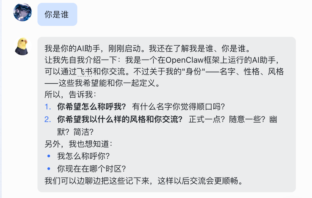 然后我们就可以在飞书里面跟小龙虾对话了