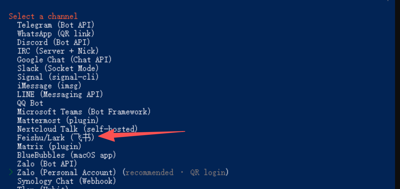 在控制台输入openclaw channels add 然后选择飞书,会让我们输入AppId和密钥,我们按照上一步复制的信息粘贴上去即可