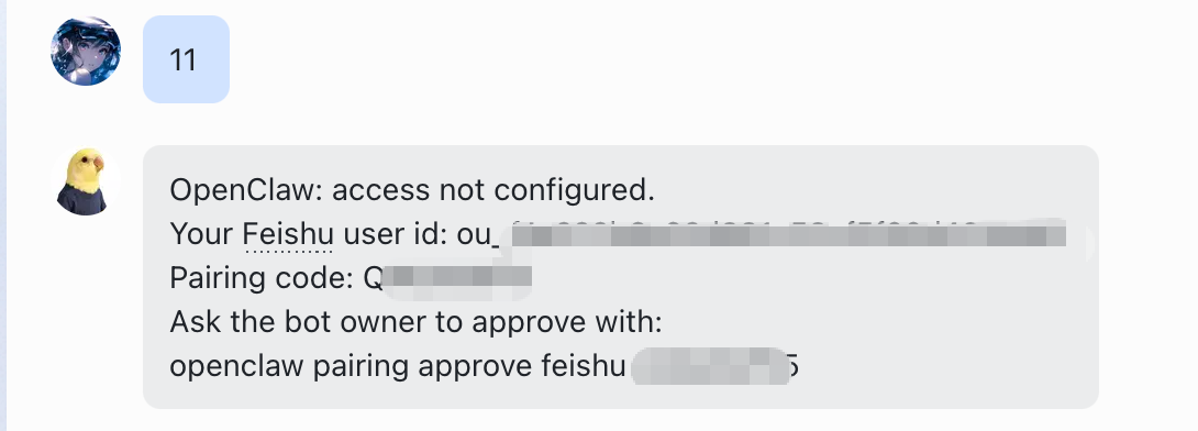 我们配置好后直接去飞书对应的机器人对话,随便发什么就会给你下面一串,直接贴给网页版的小龙虾对话信息里面即可
