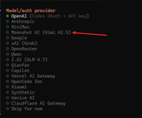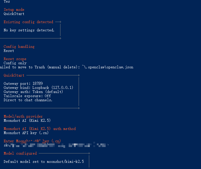4. 继续安装选择月之暗面(推荐)并选择kimi.cn(国内)和对应apiKey
