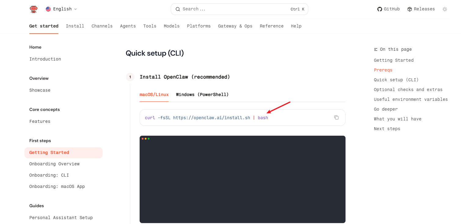 本文直接基于小龙虾官网安装的方式直接安装,分为macOS/windows,理论上Linux跟macOS是一样的